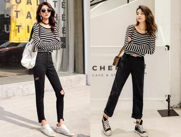 黑色休闲裤是属于显瘦的版型设计,无论是修身的还是直筒的,让你的腿部穿起来都特别的修长,裤子是高腰的设计,搭配条纹上衣,大圆领的设计颈部线条看起来就特别的显个性了,这也是今年最时髦的搭配。