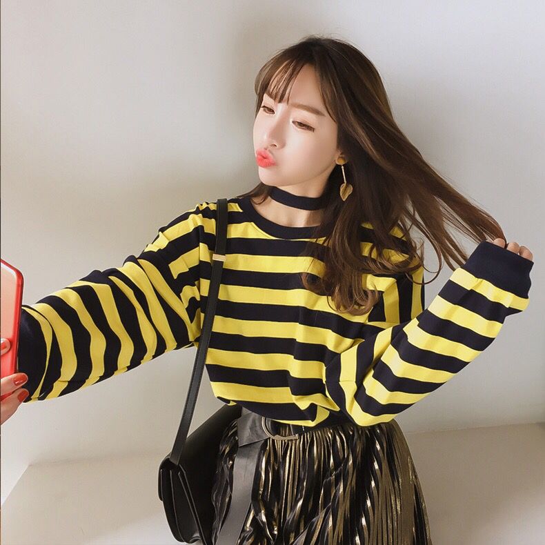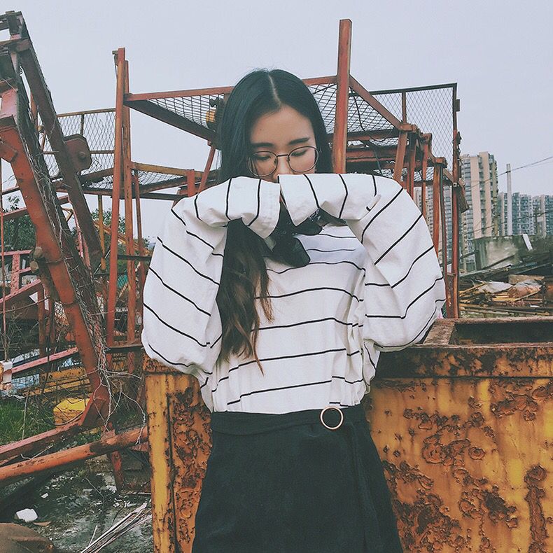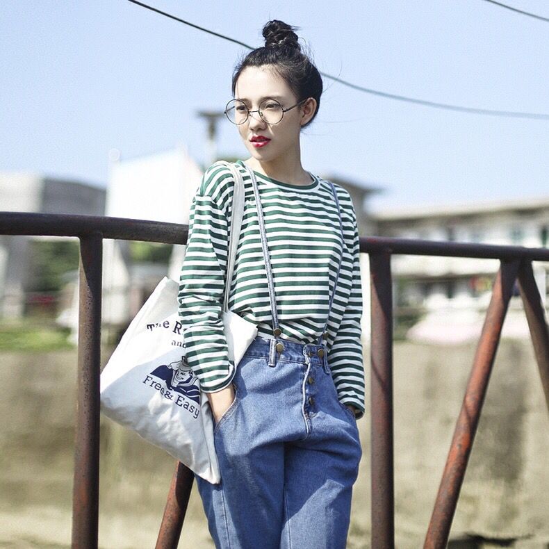 圆领的长袖T恤搭配,横条纹复古文艺,宽松的版型舒适显瘦,下摆前短后长、两侧开叉设计,显得别致时尚,单穿的时候也不会显得单调乏味,四款颜色可选,搭配背带裤裙、半裙都会很美的。