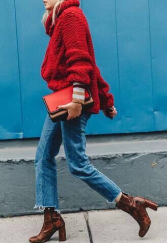 你是什么气质,想呈现出什么感觉,就去选择对应的颜色来装饰自己。比如上面这张街拍,红色作为题色热烈又温暖,用牛仔裤和踝靴来搭配恰到好处。