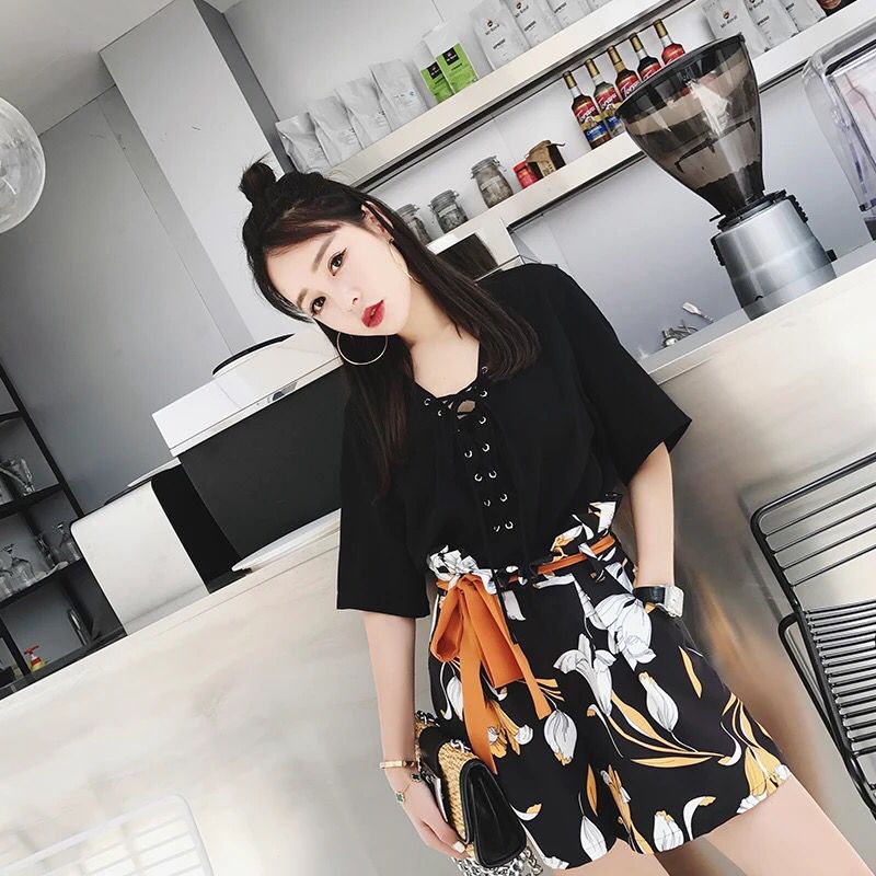 黑色系的上装,奠定了百搭的基础,同时还对于不够完美的上半身身材具有极佳的修饰效果,V领的领口加由绑带元素作为点缀,性感又不显色情,下身的高腰版型,拉高腰线的位置,显瘦又显腿长。