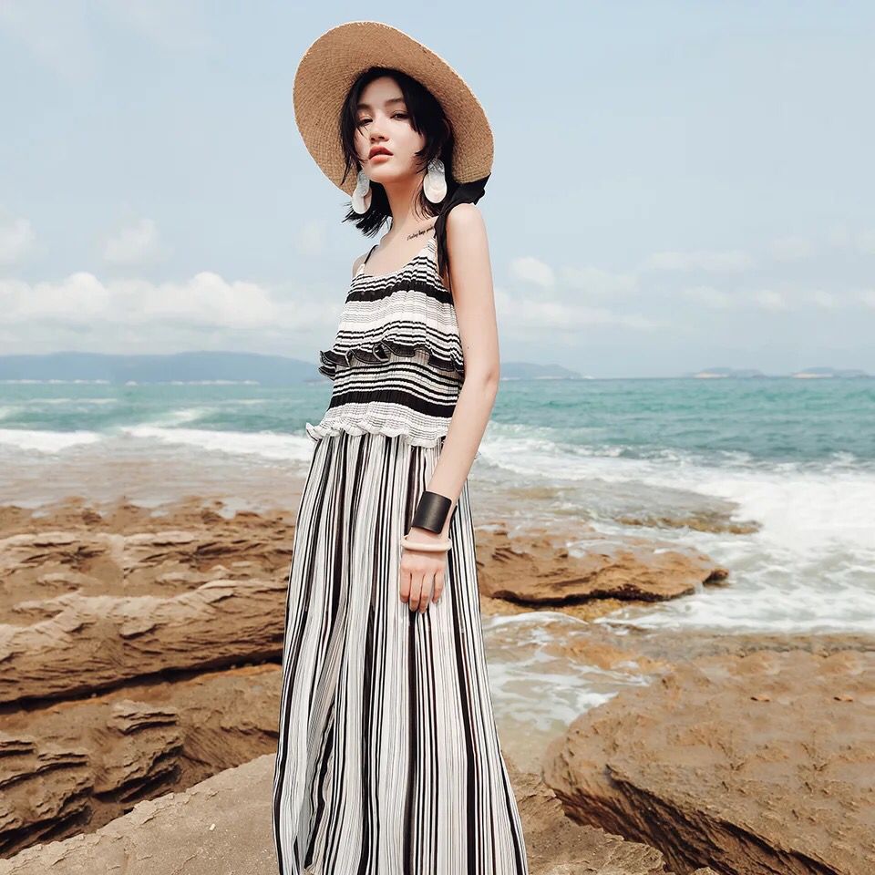 上半身的吊带,清爽又简练,避免了夏季的高温天气,而黑与白的撞色条纹,经典又不缺乏时尚气息,同时还附带视觉显瘦的效果,可谓是一举两得,下半身的阔腿裤版型,加由轻薄面料的辅助,从而不会为穿着者增添一丝额外的闷热。