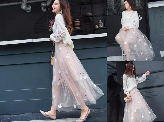 其实仙女裙就是网纱裙的缩写,带着网纱材质设计的裙子,穿上就像小仙女那样,时髦精都会用它来凹造型,这款是粉色设计的网纱裙,裙子上面还印有小天鹅的图案,看起来就像在裙子里面翩翩起舞,搭配白色毛衣,遮肉又显白,太美了。