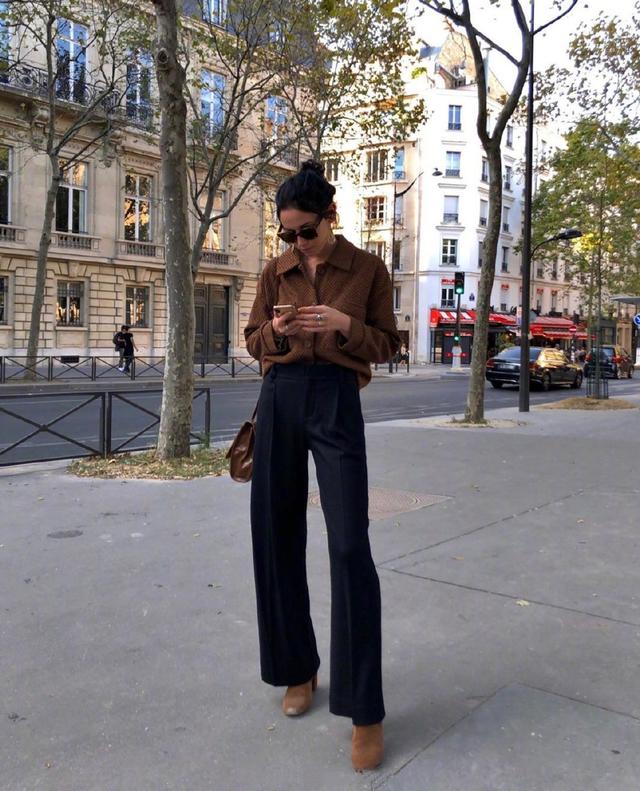 宽松的阔腿裤,让你从外看起来更加简单大气,也是问题身材女生的救星。有束腰收腹的效果,从视觉上不仅提高腰线还显高,整体上更是简洁显瘦。把修身内搭上衣塞进去,再穿上高跟短靴,一下子气场全出来了,腿长两米八有没有,时尚大气又有干练。