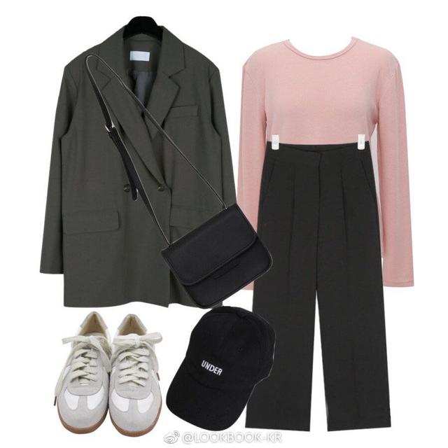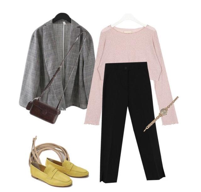 粉色上衣搭配黑色有褶皱的西装裤,十分时尚又适合上班穿搭。春天加上一款小外套保暖又时尚,上班族最经常出现的西装外套,如果你觉得不够时尚,可以用小白鞋或者棒球帽来搭配,让你的气质更加活泼有运动感。