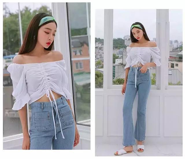 短款上衣+高腰裤搭配会拉长腿长,视觉上也会很显高。白色一字肩设计衬衫,胸前采用抽绳设计,增加了视觉上的立体感,同时露出性感锁骨,微露肚脐,小性感让人着迷。高腰牛仔裤抬高腰线,给人一种178cm大长腿的既视感。这样搭配修身显高准没错。