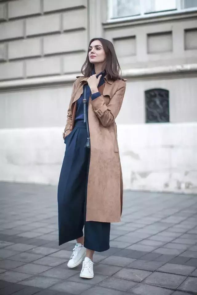阔腿裤宽松的版型能够很好地修饰腿形,同样是九分裤设计露出精致脚踝,十分显高。搭配风衣外套,叠穿混搭的风格特别适合秋季穿,即使搭配简单小白鞋,也不会显矮。矮个子女生可以放心入啦。