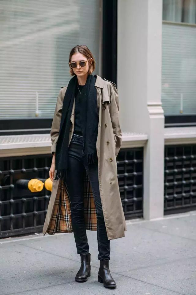 风衣是时尚百搭的单品元素,浅咖色的排扣风衣经典的版型,复古时尚的款式,谁穿谁美。值得注意的是,秋季风衣敞开更显瘦哦,再搭配一条黑色围巾,配黑色牛仔裤,穿黑色短靴,时尚范超足,简直就是行走的衣服架子了,拉风感十足。