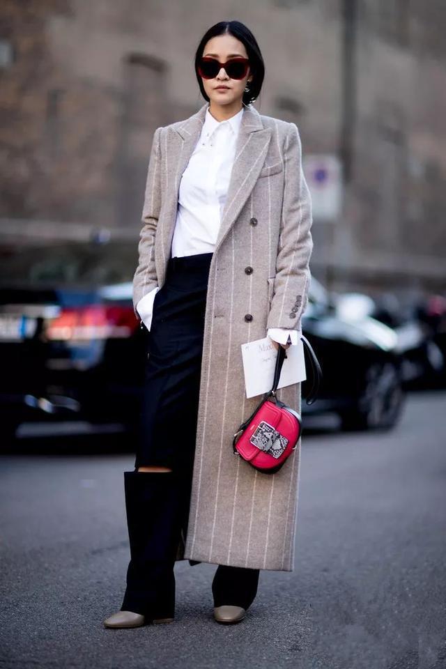 大衣搭配胖瘦皆宜,特别是H形大衣将上半身纵向拉长,极具高级感,遮住小腹不显腰粗,同时还具有显高的效果。里面搭配白色衬衫,下面搭配藏蓝色长裤,裤腿的镂空设计彰显独特个性,整体搭配给人一种干练利落而不失大气庄重之感,即使130斤也可以穿出高挑纤细的视觉效果。