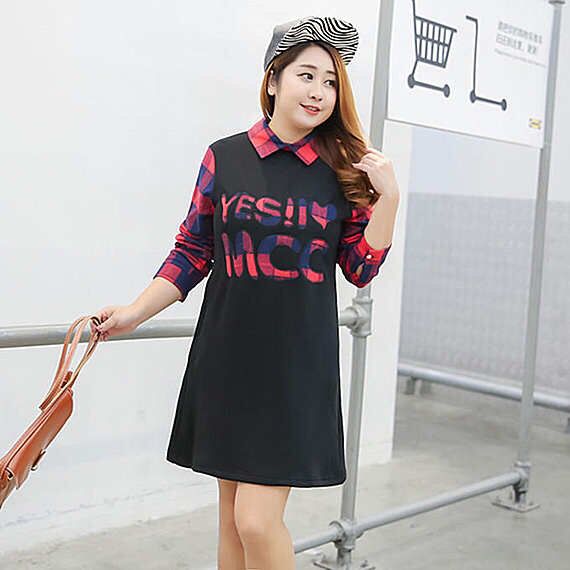 ◆大码加绒加厚打底衫:这款采用了不倒绒的材质,非常亲肤。时尚的小翻领别具特色,有假两件的感觉呢!整体的黑色调再配上超级流行的红色格子图案,还有胸前大大的字母,时尚满分!