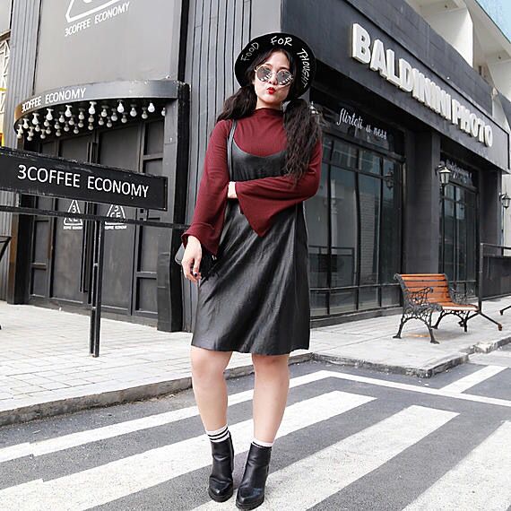 ◆大码显瘦背带裙:这款是pu材质的,挡风性能还是不错的。宽松的直筒版型很好的遮住了所有的肉肉,修饰身材绝对是杠杠的。里面搭配一件打底针织衫,别提有多拉风了!