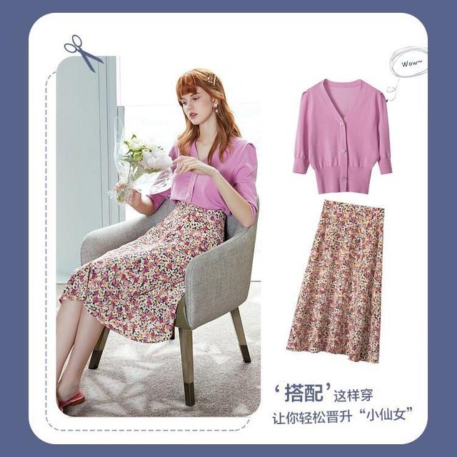 春季里,很多姑娘们的衣服首选都是针织的服饰,这种材料的衣服穿起来舒适,而且很有质感。紫色的短袖针织上衣搭配碎花长裙,软萌又可爱。