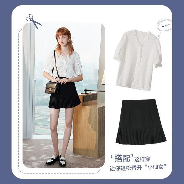 有花边的白色短袖上衣搭配小褶皱的黑色短裙,非常养眼,这样的装扮非常的有味道。脚上搭配上小皮鞋,就显得整个人的气质更上一层楼了。