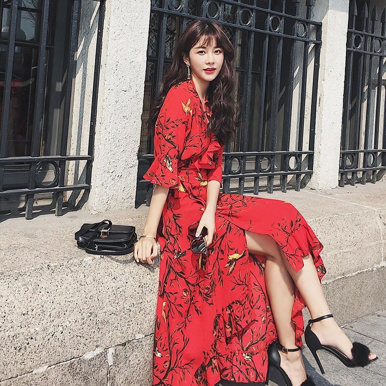 很温柔的一件沙滩度假碎花裙,注入了少女的清新情怀,简简单单一件,就能展现女孩子花样年华一般的美好,温柔芬芳。具有度假风碎花,纤细的枝条,俏皮灵动的鸟儿,轻柔灿烂的开满整个裙身,与红色的底色调和的那么和谐,显得清新又柔情,搭配大沿帽子和凉鞋,具有别样的风情。