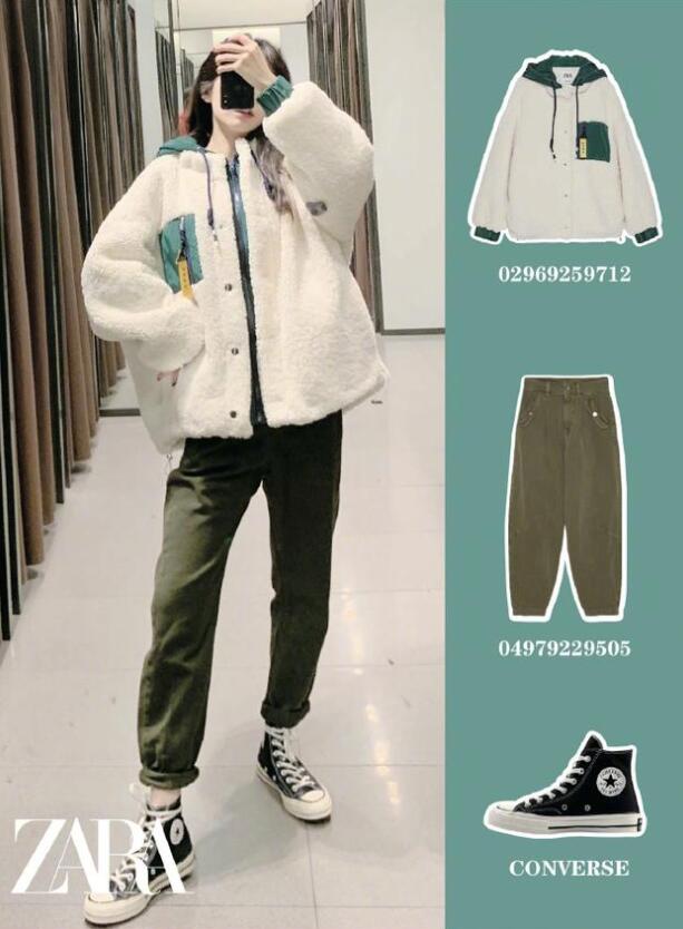 秋冬搭配最忌讳的就是显肿和暗沉。这款白色羊羔毛外套就很有活力,虽然有点宽松也不至于显得臃肿,内搭厚卫衣也毫无压力。领口与口袋的蓝色拼接设计,更显青春洋溢。下半身搭配墨绿色工装裤,多了一份不羁的感觉。