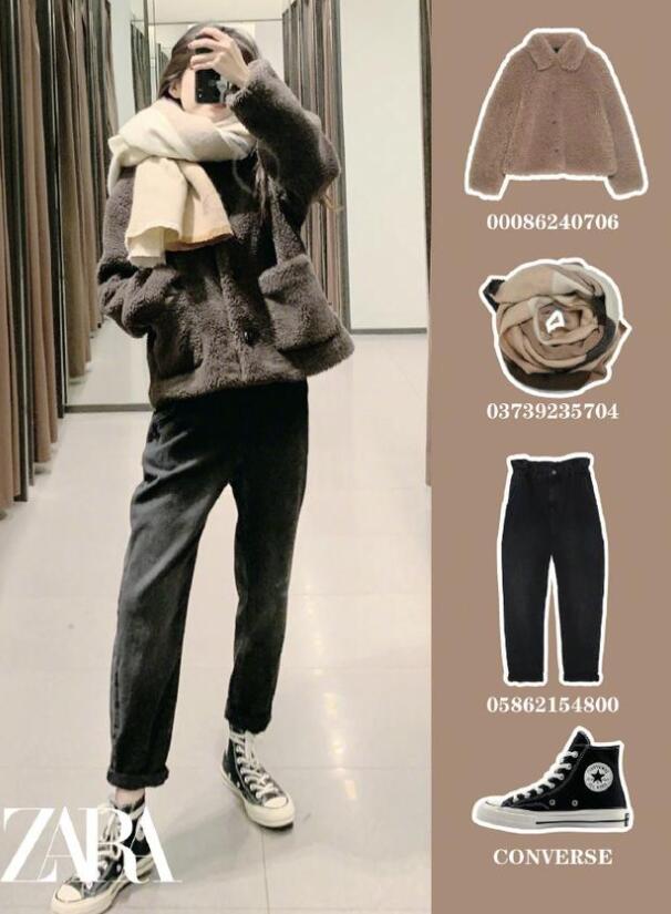 棕灰色羊羔毛就是少女最爱啊,上身都能感觉到一股软妹的气息。灰棕色很有冬天的气息,搭配一条米色围巾后就不会没有气色了。选择一条直筒工装裤搭配最经典的帆布鞋,青春气息爆棚,同时也会多一点俏皮活力。