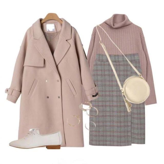 豆蔻粉毛衣和豆蔻粉大衣结合在一起能够产生出一种协调感,并且会使你的穿搭看起来更加洋气。我们可以选择一条格子包臀半身裙,搭配一件高级感十足的粉高领毛衣,文艺风满满,给人留下一种复古气息,配上一件同色系的呢子外套,合适不过了。搭配一个米色的圆饼包,和一双白色的绑带平底鞋,让你的穿搭看上去更加养眼。