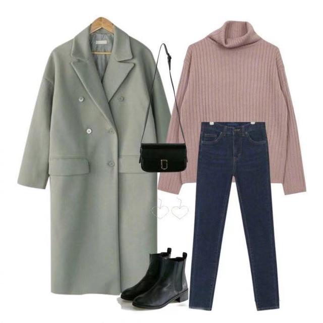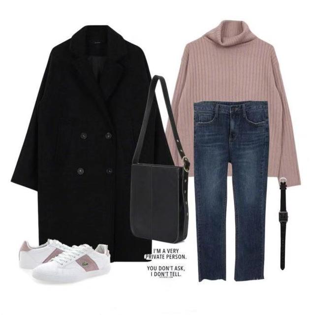 牛仔裤也是很日常的一个款式了,建议大家可以挑选一条深色系的修身牛仔裤搭配豆蔻粉毛衣,这样不仅可以很好的修饰腿型,让你的腿部线条看起来更有型。挑选一件灰绿色的长款呢子外套,选择这样的外套色彩柔和时尚感更强,整套穿搭看起来更加高级,绿色和粉色的大衣有色彩上的对比感,能够展示出女人气质。配上一双黑色的平底短靴和一个黑色的精致小包,看起来更时髦。