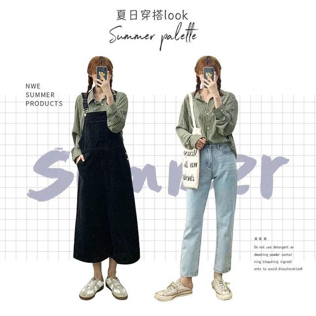九分的长度使得脚踝刚好可以露出来,穿鞋子会非常好看。上衣就穿一件绿色的竖条纹衬衫,竖条纹的设计让女人看起来显高又显瘦,凸显个人的大长腿优势。