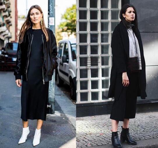 温柔的裙子,因为黑色,也多了几分不羁个性,尤其是搭配黑色大衣之后,简约又高级,配上一双黑色裸靴,修饰腿型,娘man平衡,帅气不失女性的柔美感。