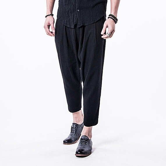 4.宽松亚麻哈伦裤,亚麻材质的裤子加上立体裁剪绝对是大腿粗,小腿粗人的福音,这种设计可以完美的修饰塑造腿型,遮盖缺点。九分的裤长可以露出较细的脚裸,显瘦棒棒的。非常适合对腿部不满意的男生!