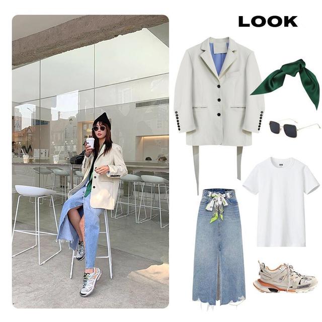 这套穿搭体现出来的街头潮流范儿是比较低调的,白色的西装内搭一件白色的T恤格外的简单,没有任何多余的设计或是饰品,但是也穿出了一种让人难以抗拒的潮流,很多人还会争相模仿。裙装搭配一件牛仔裙,高腰的设计凸显腰身,开叉的设计让双腿更具性感与魅惑,鞋子搭配一双老爹鞋,穿出女人的风姿卓越。
