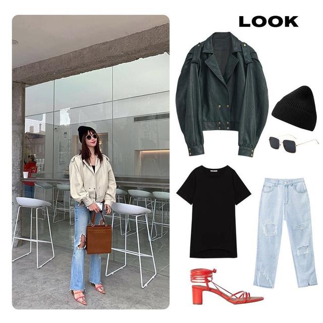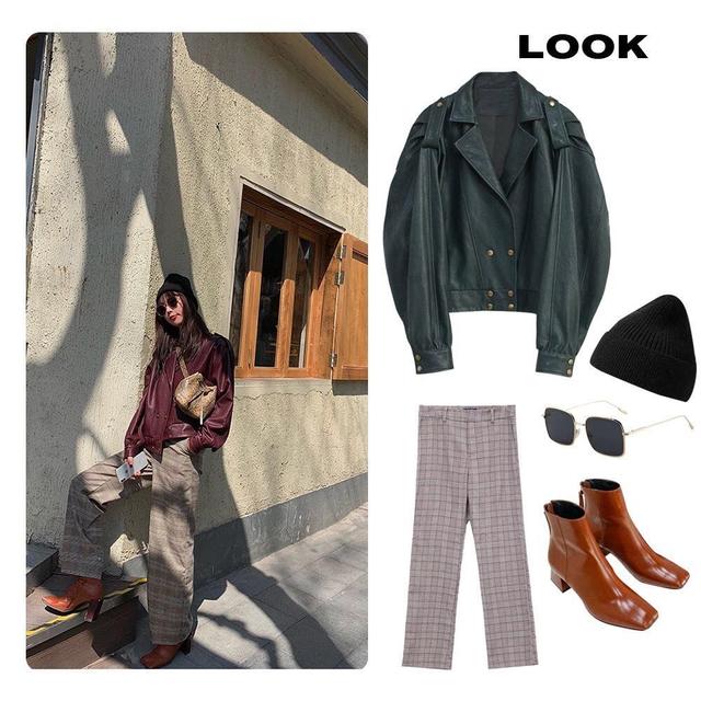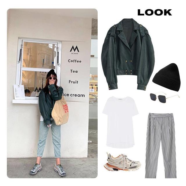 这一套依然是帅气与时尚不减的穿搭,但是它更适应于日常休闲穿着。墨绿色的皮衣可以把女人彰显出一种成熟的魅力,所以比较适应于轻熟的女人。竖条纹的九分裤既可以显示修长的双腿,同时也符合皮衣的帅酷感,搭配一双充满ins风格的老爹鞋,魅力值也是爆棚的。
