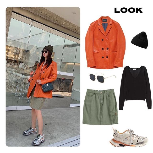 设计比较有西装风格的橙红色皮衣是非常亮眼的,皮衣比较适合一贯以来都是走街头潮流范儿的女人,她们可以将这件衣服穿出感觉。搭配一件浅绿色的半身裙,色彩上有了强烈对比,体现出女人比较不羁的性格。