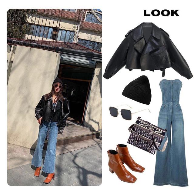 黑色短款皮衣带给人们一种机车感,但是却不会引起任何人的反感,这一种穿搭是自我风格的表现。皮衣里面搭配一条连体的抹胸牛仔裤,既性感又帅气,抹胸的设计是女人的专属设计,她代表的女人的专属气息。宽松的阔腿裤让整个人看起来大气且有气场,一双方头小皮鞋也提升了整个穿搭的气场。