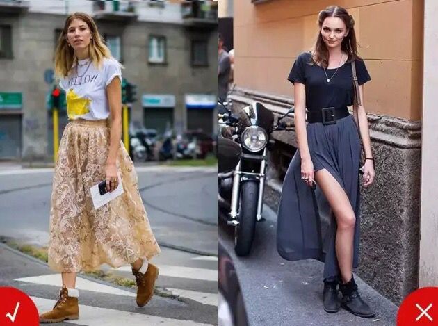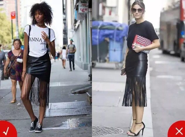 夏天穿厚重感的裙子会显得很闷,比如黑色的皮裙,但是搭配简单的颜色浅的T恤就比黑色要显得更加时髦舒服。