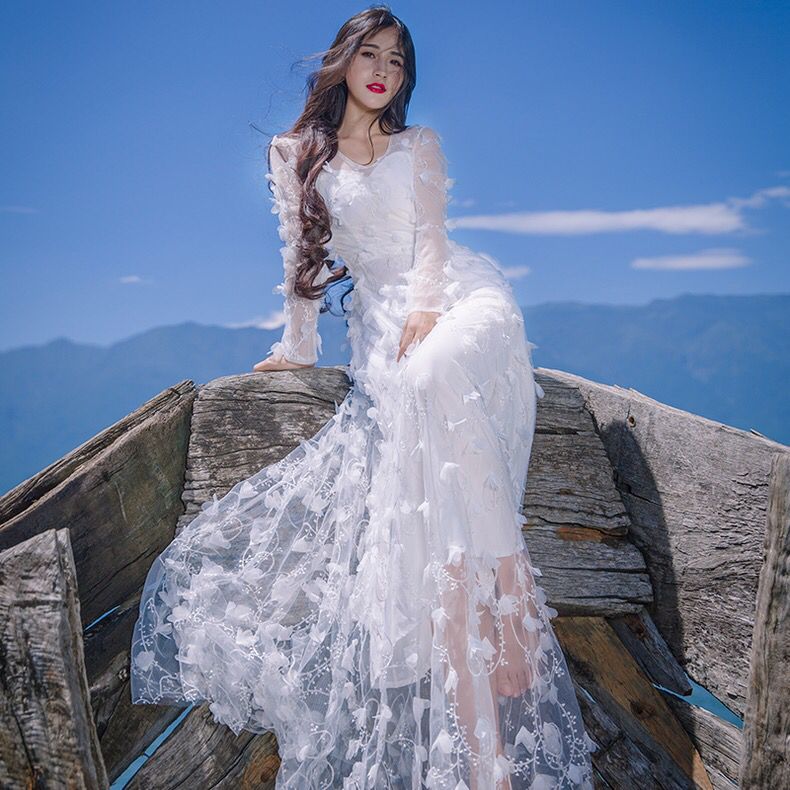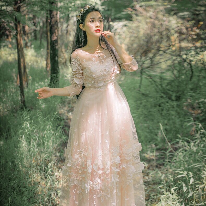 看到模特特的时候真心被美到呀,真的好想森林里猜的小仙女。抹胸收腰的版型非常显胸,宽松的裙摆能够很好地遮盖臀部和大腿的缺陷,花朵刺绣网纱更加飘逸。