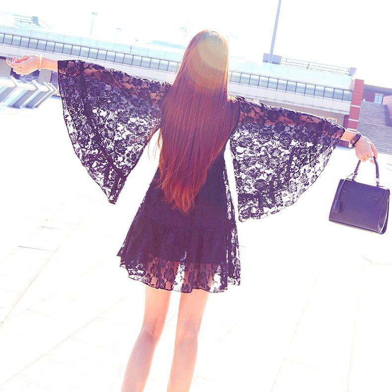 超大的喇叭袖的设计能够很好地遮盖手臂的掰掰肉,同时更加优雅随性,宽松的裙摆能够很好地遮盖臀部和大腿的缺陷,黑色蕾丝更加神秘性感。