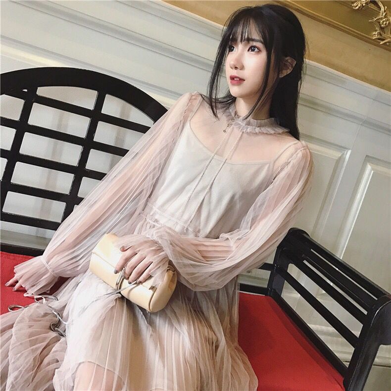 泡泡袖的设计更加活泼俏皮,半透明的网纱设计更加性感优雅,里面有内衬,不用担心会走光,清新的杏粉色十分素雅显气质。