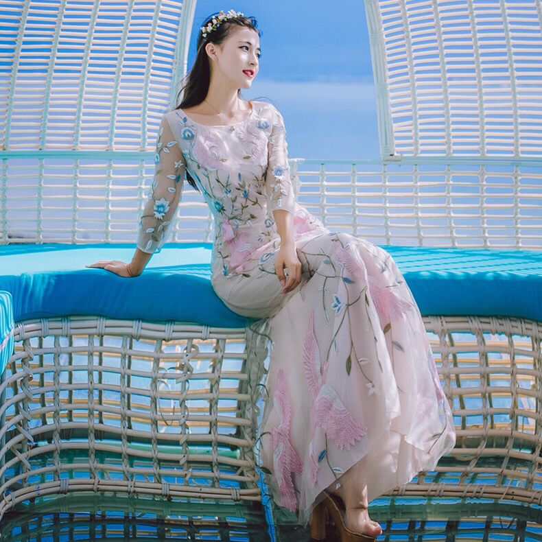 里面一件白色打底内衬,妹纸不用担心走光问题,外面一件薄纱,上面的碎花和粉色凤凰刺绣超级美腻,仙到不行的一款连衣裙。
