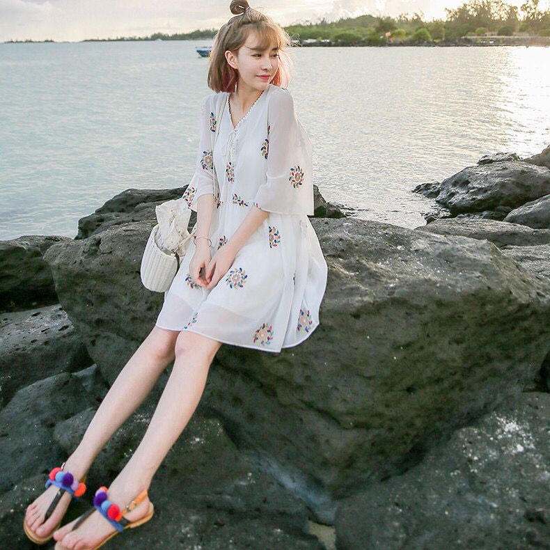 经典的V领设计更加拉长颈部线条修饰脸型,喇叭袖的设计随性慵懒,轻盈的雪纺材质十分飘逸清爽,民族风的刺绣图案更加文艺复古。