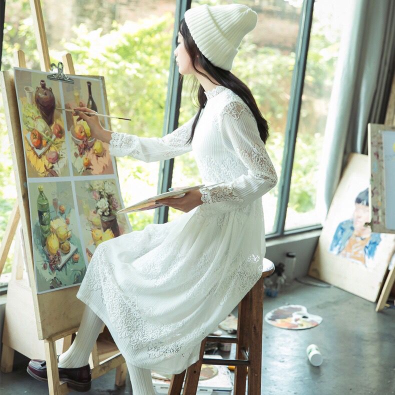 非常文艺的一款连衣裙,蕾丝的材质轻盈飘逸,非常清爽舒适,春夏穿着尤其合适。宽松的裙摆更加修饰臀部和腿部的曲线,纯白的颜色更加清新淡雅。