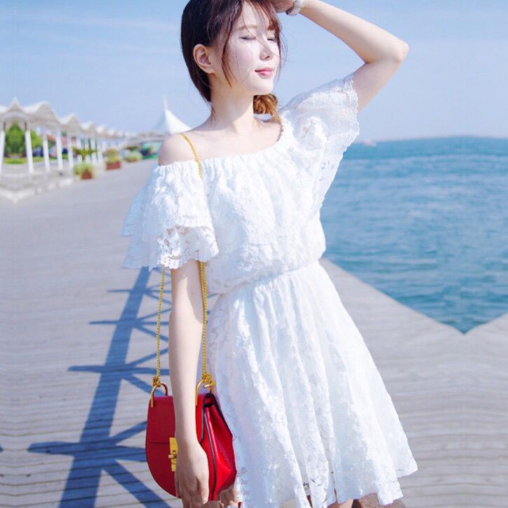 一字领的设计突出颈部和锁骨的线条,小露香肩更加性感迷人,腰部松紧的设计突出腰部曲线,飘逸的白色蕾丝仙气十足,非常显气质。