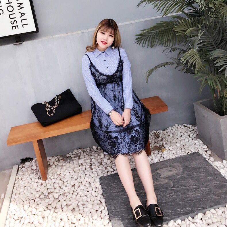 设计感很强的一款吊带裙,蕾丝吊带搭配上条纹衬衫,有着别样的和视觉感,整体的配色显得非常的清新,是休闲与精致的结合,可以分开穿的哦,单穿衬衫裙也很美好。