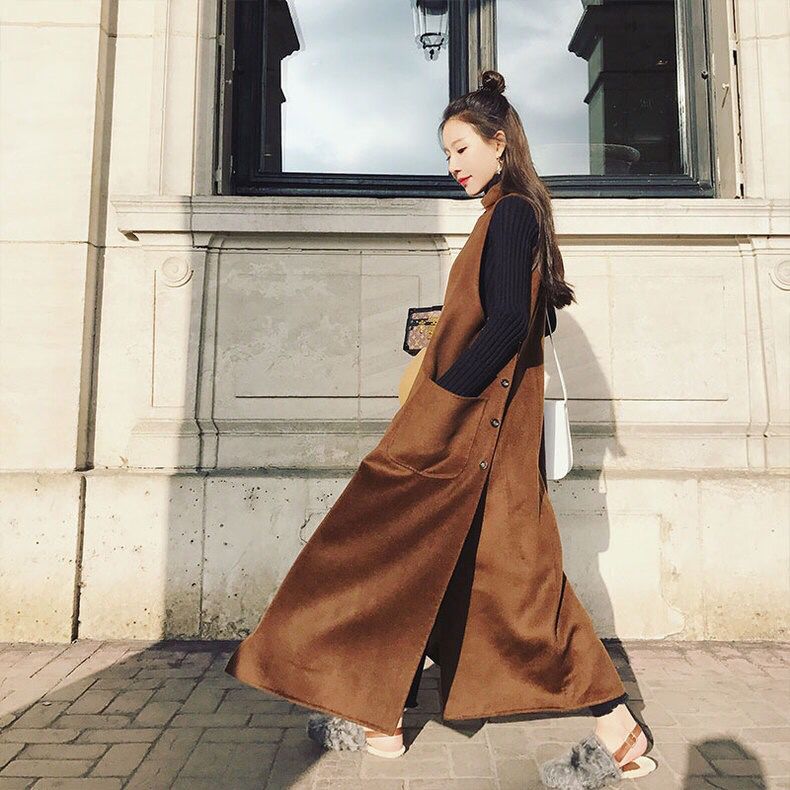 无袖马甲上身很干练。双面呢的面料相比较单面来说更保暖,咖啡色很适合秋冬,既不沉闷还很有个性。很贴合身体曲线的剪裁穿上很显瘦,侧边有个开叉拉长了腿部比例,显得整个人挺括高挑。