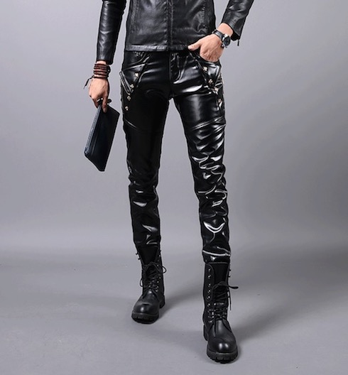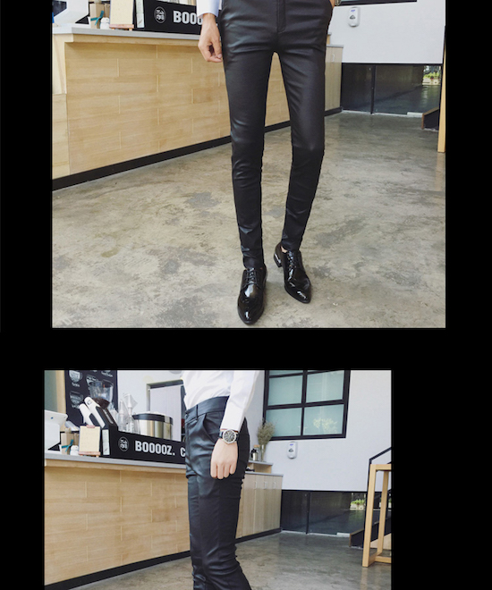 3.如果你身形偏瘦,可以选择这款修身小脚皮裤。略微收紧的裤身能够更加完美的衬托出你的腿型,超弹性能的皮质让你不要担心它的紧绷。皮裤光泽透亮,质感佳,搭配皮鞋更有范。