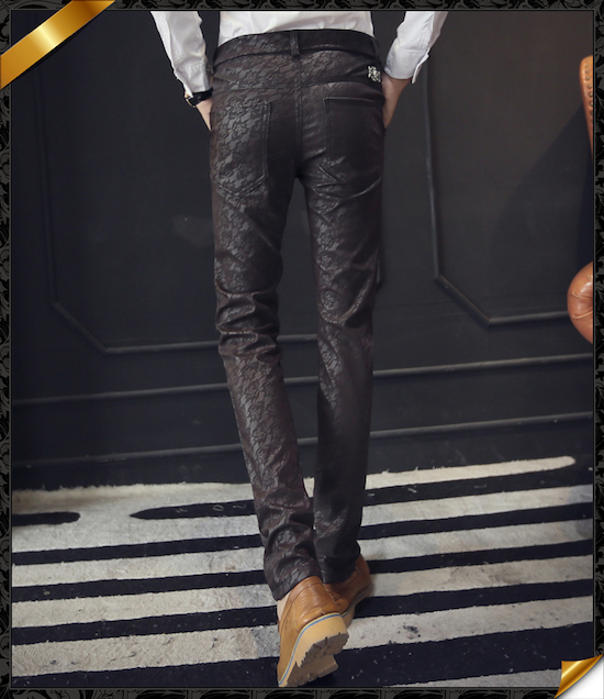 4.纯黑色太单调,休闲男装搭配,怎么能错过这些裤子看看这款暗纹提花皮裤。精选高档优质皮料,柔软有弹性。细密提花纹理为裤子增加凹凸感,让手感更佳,版型修身,让你的身形看起来更显修长。