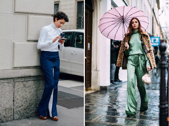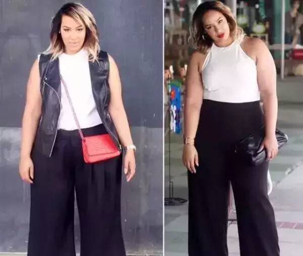 同一个人,左边腰部打褶的阔腿裤,和右边腰部胯部贴合的高腰阔腿裤比起来,是不是明显左边更显胖呢?