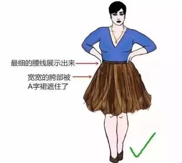而及膝A字裙把屁股和胖大腿全遮掩了、裙摆落在比较细的膝盖处,所以说这身搭配就是典型的扬长避短了。