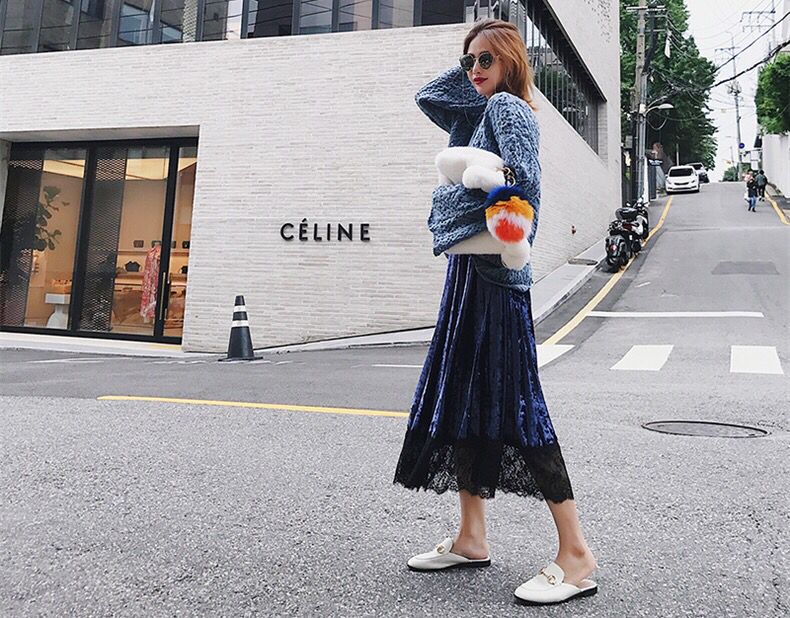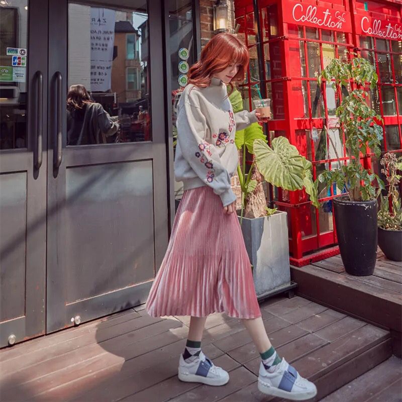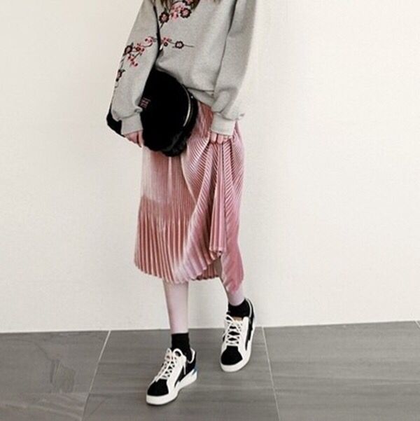 丝绒的质感给人一种厚重、高贵的感觉,十分适合秋冬。从质感方面来讲,和卫衣很搭配,不会有种头重脚轻的感觉。同时百褶设计,让行走间有一种水波流动的感觉,很有灵气,中和了卫衣过于宽松而慵懒的感觉,很有味道。