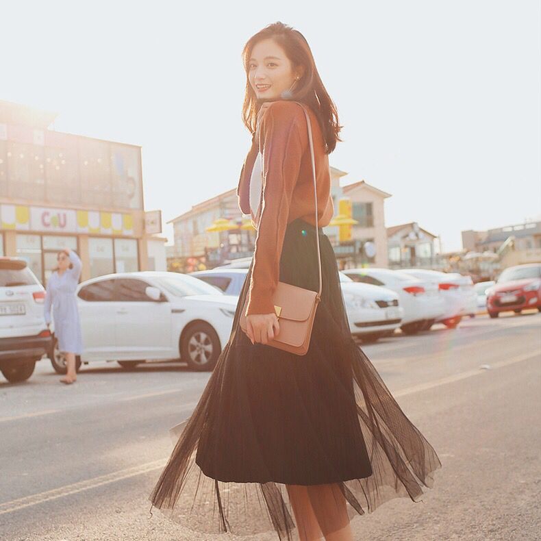 网纱半身裙给人一种飘逸的感觉,很有仙气,一般会搭配比较仙的水袖上衣,给人一种朦胧的美感。但是搭配宽松的卫衣,偏随意、轻松的感觉和飘逸撞在一起,行走间显得飘逸灵动,身高160以下的女生,这样穿才会显高静静的站着也让人想拥入怀中。