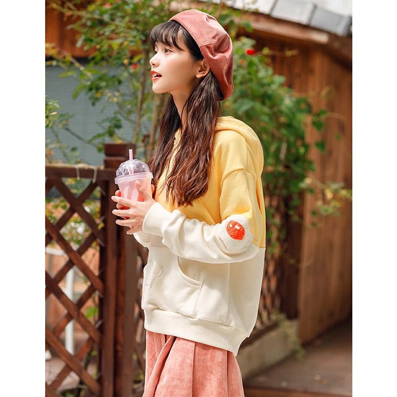 嫩黄色和白色的配色,给人感觉嫩嫩的,穿衣技巧,软软的,十分可爱。宽松的版型,舒适的面料,十分软萌。腰部的两侧口袋,方便插手,凹造型。衣袖拼接处的橘黄色刺绣,十分亮眼,给人一种调皮的感觉。