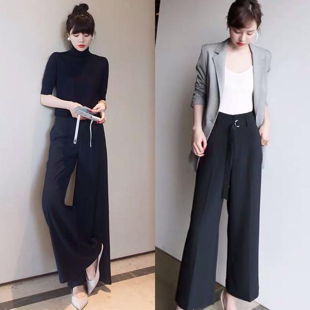 宽松的西裤比起那些正式装西裤更多了几分的优雅与淑女,尤其是裤脚部分非常的宽松,但是腰部又比较的窄,让女人的双腿看起来格外的苗条。