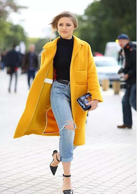 在冬季内搭一身黑的基础上加一件黄色毛呢长款大衣,沉闷感分分钟扫光,搭配撞色格子连衣裙,冬日也可以灿烂活泼。
