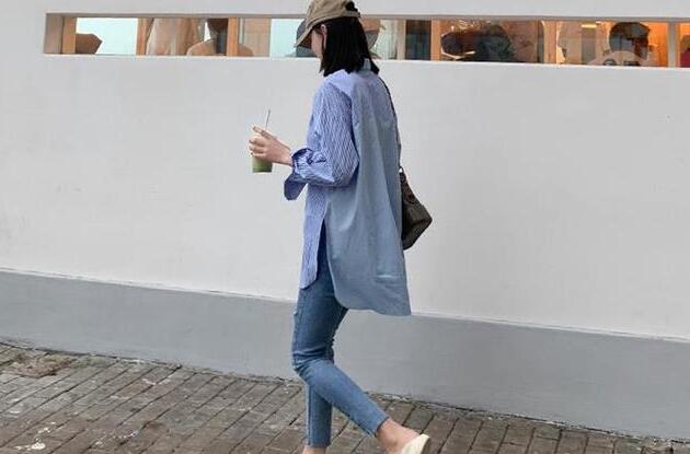 中长款的衬衫一般都会用来搭配紧身裤穿着,不仅带有灵动之感,也将整套Look凸显的简约大方,中长款有一个好处就是可以遮掩臀部上的肉肉及其腰间上的赘肉,显高和显瘦的指数可谓是满满的五颗星哟~