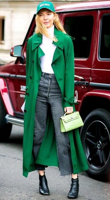 冬天来件绿色外套使是极为不错的,这款绿色外套采用长款设计,可以给小仙女足够的温度。内搭白色高领毛衣,简直是2018年保暖穿搭呢。手提浅绿色包包,头上pick绿色的帽子,三种深浅不同的绿色,显得特别有层次感。脚踩黑色的短靴,使小仙女看过去高挑了不少呢,尽显优雅气质。