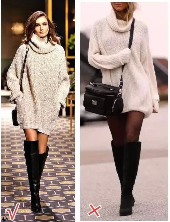 注意毛衣的长度,如果要搭配较为宽松的针织连衣裙,长度稍长最好。要适当的露出一小截大腿,但不要太多。